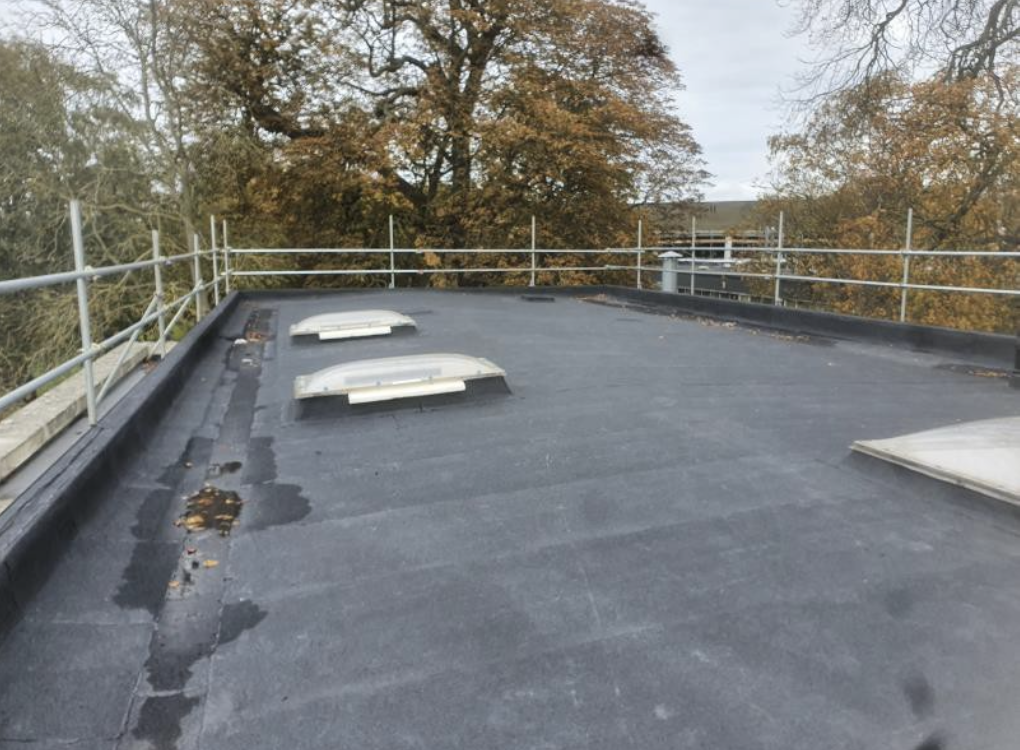 Access & Preparation: Full scaffolding was erected to provide safe access while allowing the building to remain operational. Moss, debris, and blisters were removed before installing a bituminous primer.